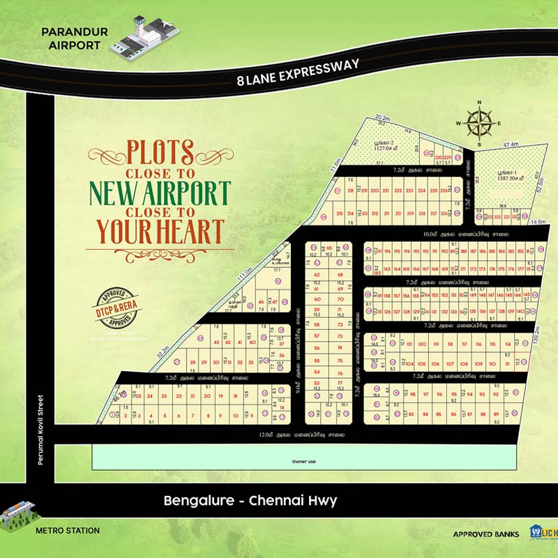 Strategically located just 500m from the Chennai–Bangalore Highway and minutes from the proposed Pillai Chattiram Metro, this project in Parandur (Sunguvarachathram) sits at the heart of a rapidly transforming growth corridor. With the New Chennai International Airport coming up just 2 km away, the region is set to become a major hub for trade, travel, and development.
