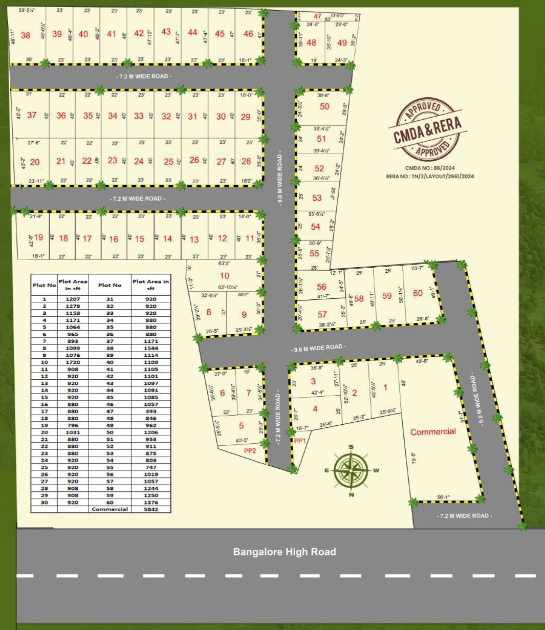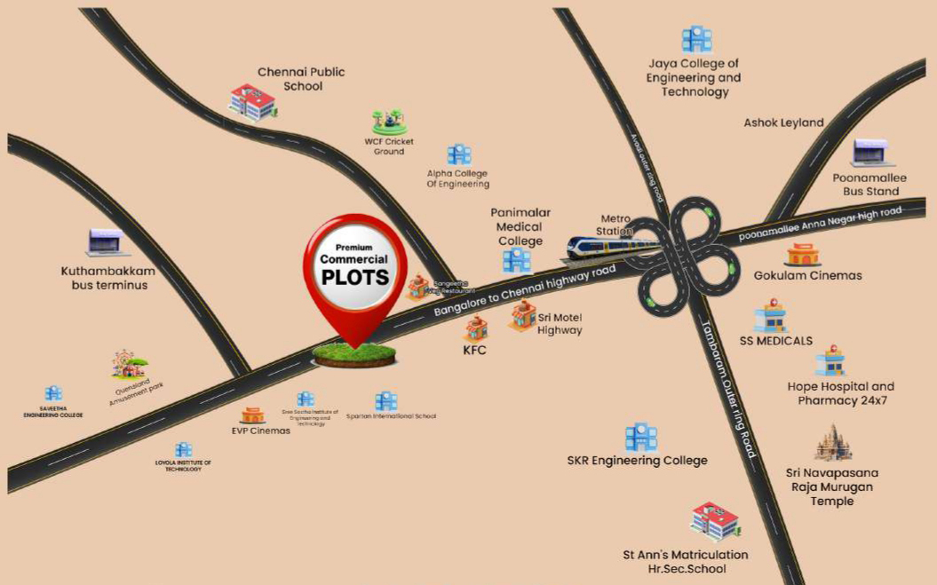 Welcome to a plotted community that blends smart investment with smart living – just off Bangalore Highway, next to Kuthambakkam’s new bus terminus, metro station, and Panimalar College. Spread across 2.4 acres, this CMDA & RERA-approved enclave features 60 exclusive plots (747–1736 sq.ft.) with a rare 5,842 sq.ft. commercial zone, making it a hotspot for those who want their land to work double – for home and income.