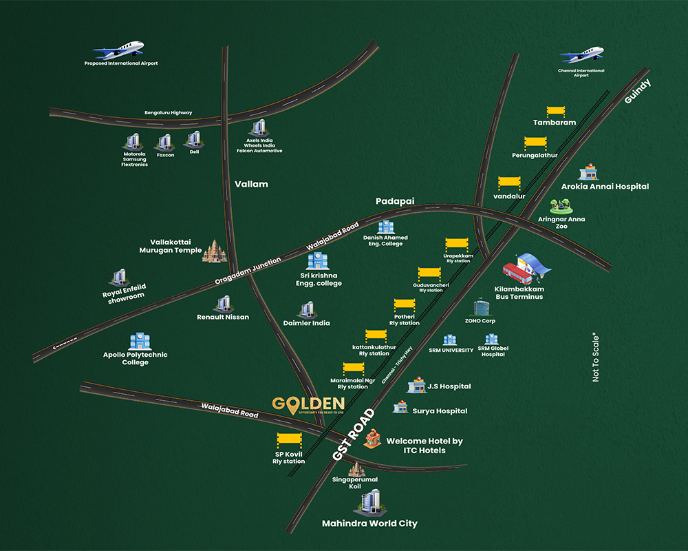 Nestled in the spiritual heartland of Singaperumal Koil, just minutes from Chennai’s key corridors, Golden Plots offers more than land – it offers legacy. Surrounded by iconic temples, lush greenery, and fast-growing infrastructure, this DTCP- & RERA-approved development blends tradition with opportunity.