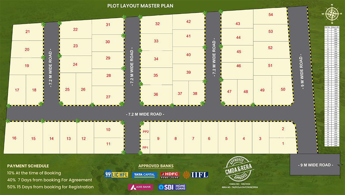 Vatsa Vivid brings you 54 luxury villa plots ranging from 765 to 1270 sq.ft., meticulously designed to match your dream home’s elegance and comfort. Set in the calm of Kattupakkam, the project offers a rare blend of serenity and connectivity, with wide internal roads, green surroundings, and a thoughtfully planned layout that supports a relaxed lifestyle.